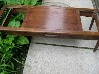 There are two identical openings on each side of the table top. I have no idea what used to be there before. Originally, I thought it might have been a piece of glass, but I do not think so because it is not designed so that the view through the table is pleasing. You can see underneath which is not perfectly finished. So, what to do? I am not sure. I have posted the question on one of the flickr groups that deals with things salvaged from the trash, but I have not received any input. If and when I do, I will post it.