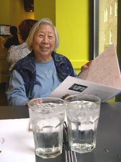 It was all tied up with a nice bow when my Mom and I had lunch. (A lunch where we were served ginormous glasses of water if you were to rely on the perspective of my camera shot.) Actually, the funny thing is that the menu really IS that big. I think there are about 300-400 items on that menu. I am not kidding.