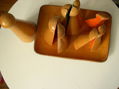 As mentioned, I do have a tendency to buy things without knowing what they are. I purchased these at a church sale last week. I have no idea what they are. I just thought that they made a nice sculpture. The tray did not come with it. It was a separate purchase. The women working the sale asked me what they were as well. There are four of them. One is solid. The other three are cut into halves, thirds, and quarters.
