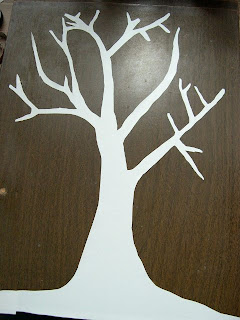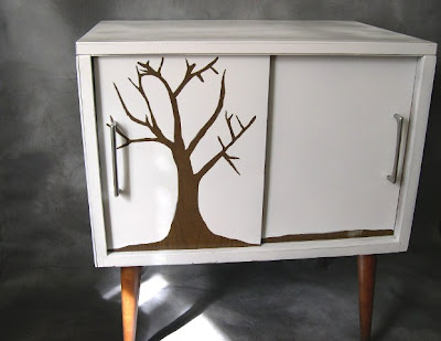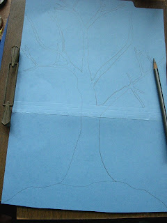 First I drew a picture and cut out a stencil from a leftover file folder. I wanted to use an image that would benefit from the wood pattern of the original piece.