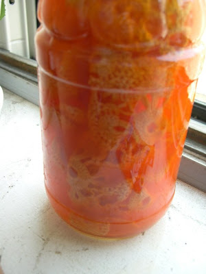 I have been collecting various doilies and runners over the past few months at rummage sales and thrift stores. My intention was to dye them bright colors in order to cut down on the elderly great aunt factor. I have seen some that were a dark black (I will try that later on) , but it was the bright orange variety that caught my eye. I thought I would try the Kool*Aid method first and if it was not to my liking I would then use the old stand-by.....Rit. I did not follow any specific instructions. I decided to just wing it this time. (Probably a mistake)