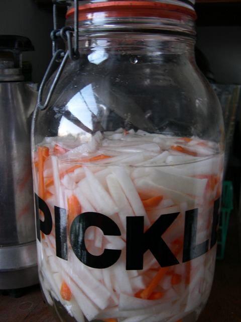 Remember I mentioned that I am trying to learn how to make things that I usually go out and buy? Well, when I was recently at a rummage sale I came across this great big vintage 3 litre clamp jar with PICKLES across the front. Grabbed it. I came home and taught myself how to make the pickled daikon that I am always spending my money on when I go get Chinese barbecue. I spent less money on this entire 3 litre jar than I do on a little Dixie cup full from the restaurant. Plus, it rationalizes my purchase of the jar.