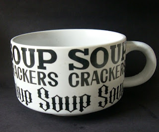 It is a grey day here with some lake effect snow falling down which can make one think of a big bowl of soup. I have recently become drawn to things with text in interesting fonts. I think this has to do with my new found interest in letterpress and type in general. (Which I know nothing about.) I stopped in at a thrift store and came across this mug.