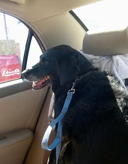 (Cue the George Michael music) Yeah! After almost two months, the vet said we could take off the e-collar! This is the joyful ride home from the vet visit today. (I am sure he would have been laying down (now that his movement is unobstructed, but hi mother made a stop at the Goodwill before the vet and there is a rather large picture propped up across the back of the front seats hindering his comfort.)