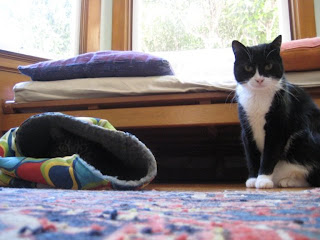 I was worried that the cats would have no interest in the tunnel at all. I had suggested that they use reverse psychology and act as if the tunnel was not meant for the cats. There was no need. I am so pleased that the cats really seem to enjoy it. I am not sure if you are able to see that there is a little cat face looking back at you from inside the tunnel.