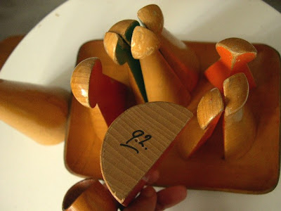 As mentioned, I do have a tendency to buy things without knowing what they are. I purchased these at a church sale last week. I have no idea what they are. I just thought that they made a nice sculpture. The tray did not come with it. It was a separate purchase. The women working the sale asked me what they were as well. There are four of them. One is solid. The other three are cut into halves, thirds, and quarters.