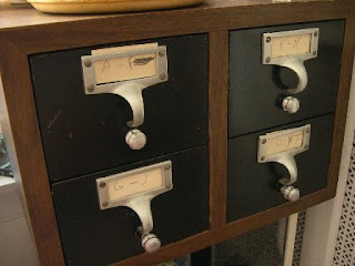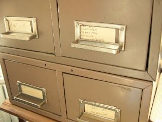 I also scored both of these 2 drawer metal card catalogs as well. My original thought was to spray paint them some fabulous color before using them. I still intend to paint them, but I need to put them into use now.