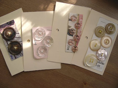 The large single buttons that I thought were extra special were sewn onto much smaller cards. They will be used on one of two Rolodex card holders for easy flipping.