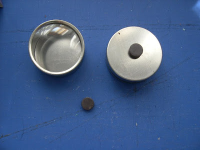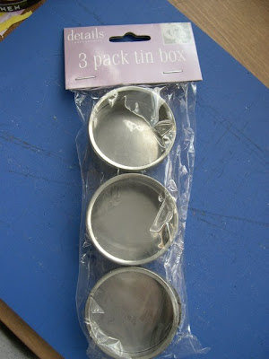 Remember these small tins from the dollar store? Package of 3 for $1. They are meant for wedding favors. They reminded me of those magnetic spice containers with the metallic strip for storage.
