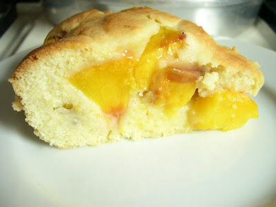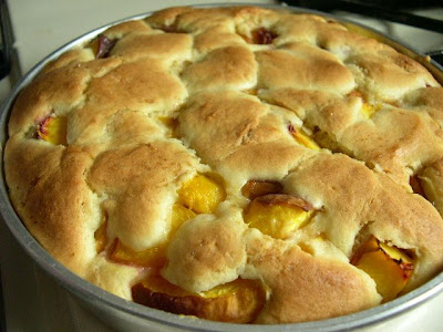 I was inspired by Angry Chicken to make this Stone Fruit Teacake. The recipe is from the book Rustic Fruit Desserts. I ad to act fast because the peaches were getting ripe and we are expecting record heat this weekend. Early this morning after my run I stuck this in the oven and here is what emerged.