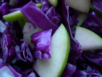 another delicious way of preparing purple cabbage is to slice it, put it in a baking pan, drizzle it with olive oil and balsamic vinegar, and roast it in the oven. It retains its crispness while also being tender and the roasting helps it carmelize nicely. Golden raisins can be added for sweetness if desired.