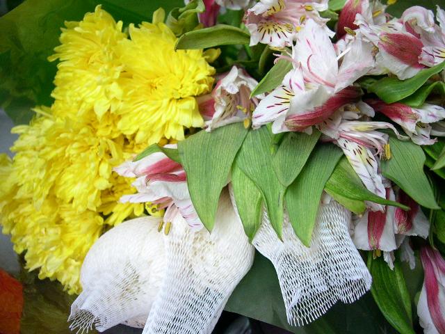 Have you ever wondered about the flowers stuck in a bucket next to the bargain produce at the grocery store? You know, the ones lumped in with the overripe mangoes and tomatoes? Me, too. There was a big bucket of these "bouquets" at the store the other day. Each bunch was made up of three types of flowers. They were originally $9.99 and they were now $2.99. Worth an experiment, right? I looked them over and tried to pick out the bunch that looked the least dead.