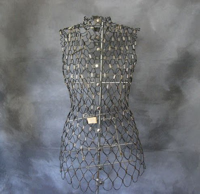 I do believe that sometimes things are just meant to be. I believe this to be true in life as well as shopping. A few weeks ago I was determined to try making one of those duct tape body double dress forms. I had tried this before a few years ago with an unsuccessful result. I should have used the method using an old t-shirt that you are then able to cut off of your body. I was also disappointed to find out that my body double did not resemble Marg Helgenberger one single bit. Anyway, I was ready to bite the bullet and try the improved method. One day over lunch I warned my mother because she would have to be the one doing the binding, taping and cutting. She was not thrilled. On the way home I stopped at a thrift store on a whim. I told her I was just running in to take a look and I would be right out. There she was. It was meant to be. A vintage Dritz My Double wire dress form...and she was half off. I grabbed her right up. As I headed out of the store and toward the car my mother said, "Oh good, then I don't have to tape you up."