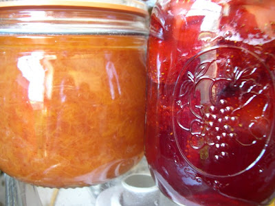 Now I just can't seem to stop myself. I want to try making every fruit into a preserve for the fall. This time it was the peaches and the strawberries. They became peach butter and strawberry jam. I was lazy with the peach butter recipe. I will do better next time. I did not run it through a food mill. Since I am the only one who will be eating it I figure it does not matter. Next time I will probably peel the peaches (though you do not need to with that recipe) just in case I get lazy again.